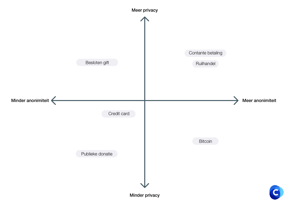 Er tegenover staan transacties die niet anoniem en niet privé zijn. Denk aan een publieke donatie aan een campagne, waarbij je echte naam, het doel en de hoeveelheid door iedereen in te zien zijn.