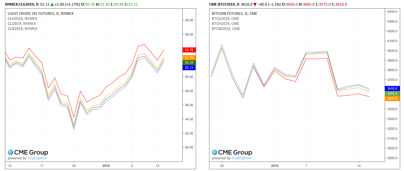 Olie is in contango. Hoe verder weg de datum, hoe hoger de prijs. Bitcoin is in backwardation. Hoe verder weg de datum, hoe lager de prijs.