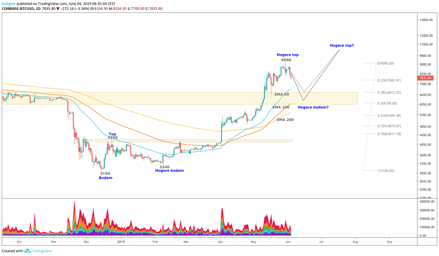 De 50-daagse EMA ligt op dit moment rond de $7000. In dezelfde regio op $6812 ligt ook het 0.382 fibonacci-niveau van de stijging van $3128 naar $9090.