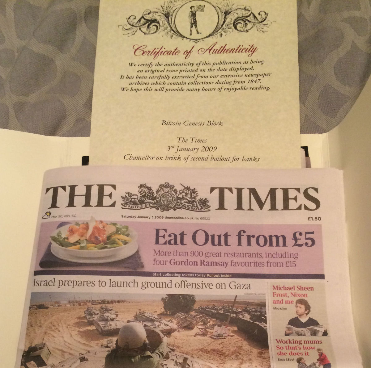 Het eerste block bevat de tekst "The Times 03/Jan/2009 Chancellor on brink of second bailout for banks." Het is een verwijzing naar een artikel in The Times over extra miljarden om de banken te redden. Het suggereert dat Bitcoin een alternatief voor het bancaire geldsysteem voorstelt.