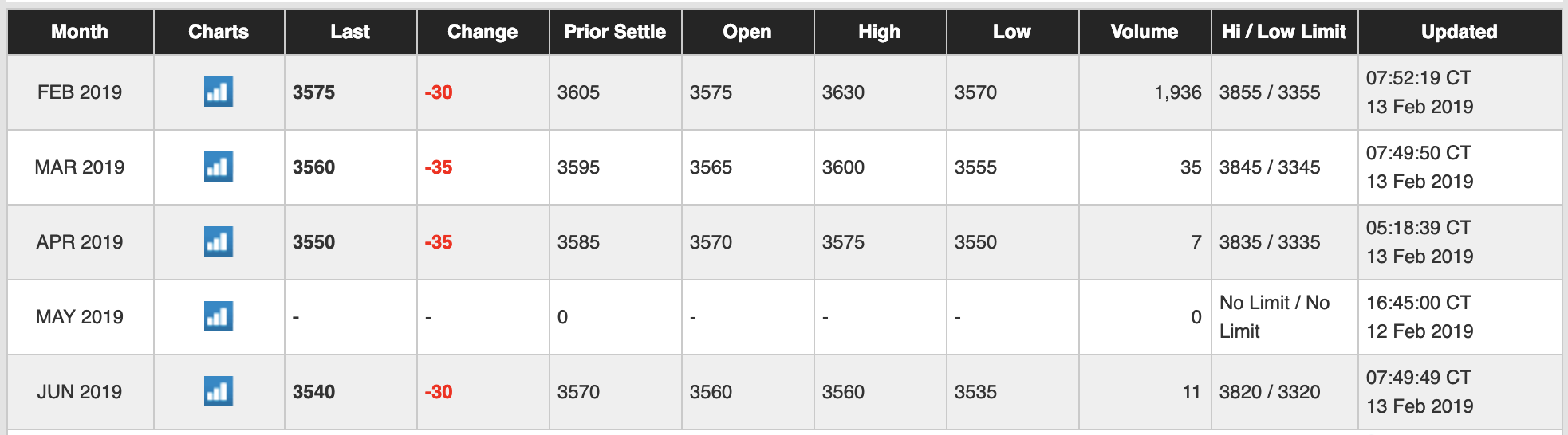 Je ziet dat de lijnen met elkaar (en de spotprijs) meebewegen, en dat de afstand ertussen min of meer gelijk blijft. Die afstand tussen de lijnen is de forward curve.