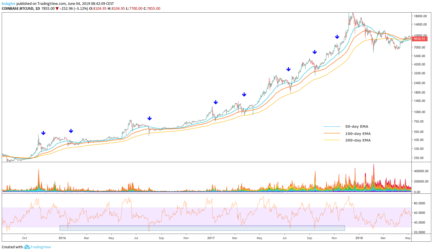 Als je kijkt naar eerdere bull markets van Bitcoin, dan zien we dat de verschillende EMA's op de dagkaart interessant punten markeren.