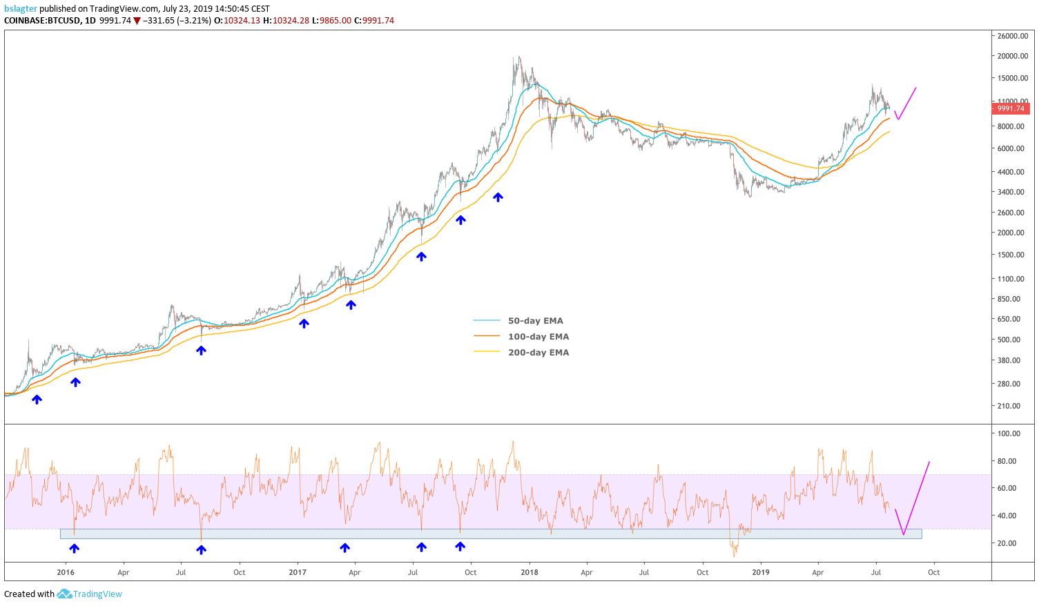 In de BTC-update van deze week lieten we zien dat de correctie naar $9060 misschien al wel de correctie was die we verwachtten. Maar een diepere correctie naar de regio van $7200 tot $8500 zou niet gek zijn als je kijkt naar de EMA's en RSI op de dagkaart.