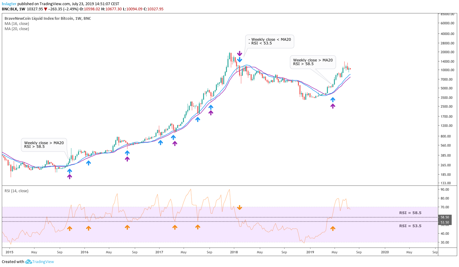 In een nieuwe bull market gaan we kijken naar deze niveau's vanaf het moment dat de weekly candle sluit boven de 16- en 20-weekse MA, met een RSI boven de 58.5. Dit bevestigt de nieuwe bull market.