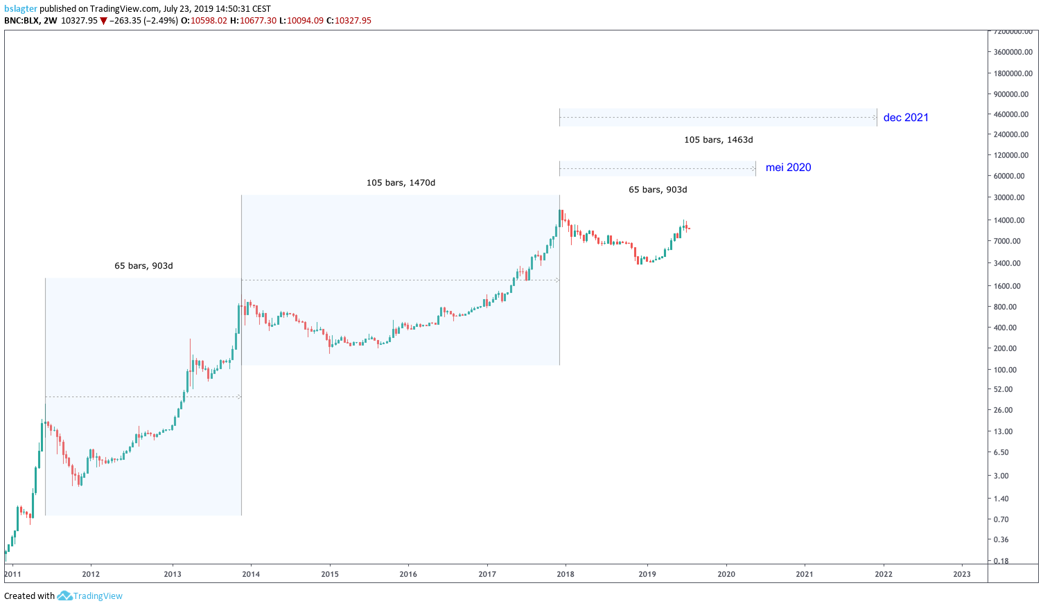 Begin december 2018 bespraken we de bodem van de bear market die op dat moment gevormd werd, en die op 15 december het laagste punt bereikte op $3128. Daar kun je meer lezen over de cyclus.