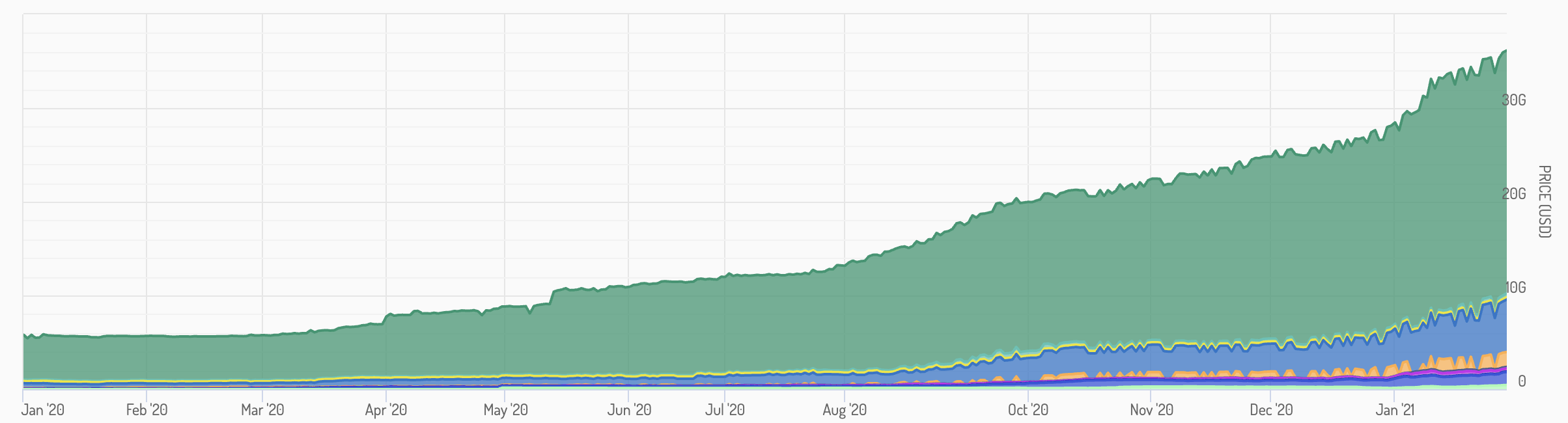 Voordat we van start gaan nog het volgende. DeFi is een experimentele technologie en in alle opzichten veel jonger dan bitcoin. Er zitten grote(re) risico’s aan, maar mogelijk ook grote(re) kansen. Dat er iets gebeurt, blijkt wel uit het vermogen dat aan DeFi-contracten is toevertrouwd. Dat groeide tussen januari 2020 en januari 2021 van 600 miljoen naar 27 miljard dollar!