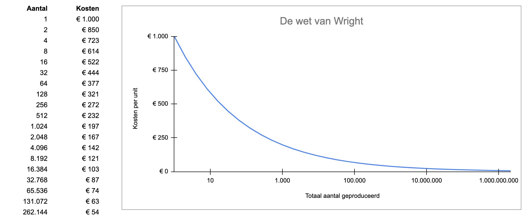 Hoe meer een technologie gebruikt wordt, hoe goedkoper die wordt. De wet van Wright beschrijft hoe dat werkt. Het verklaart waarom technologie er vaak ineens lijkt te zijn, terwijl er al decennia aan gewerkt wordt. Gradually, then suddenly!