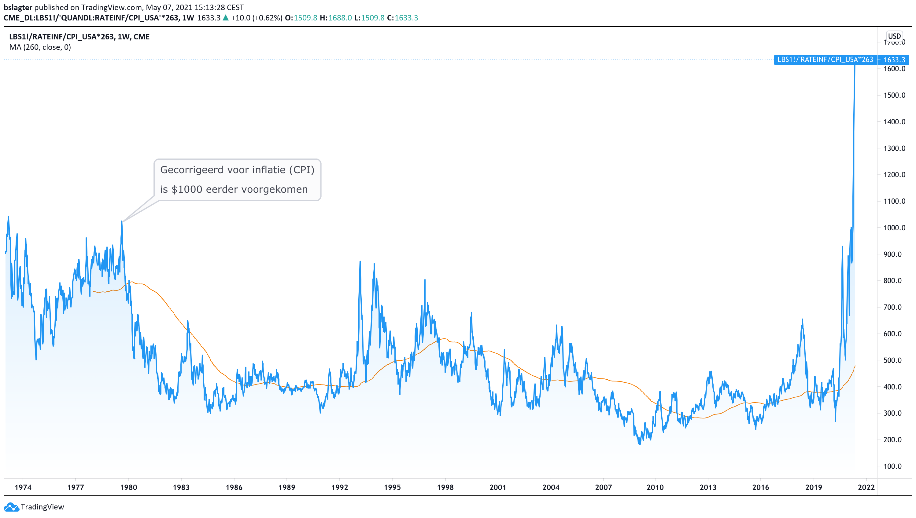 Laten we eerst eens kijken of deze hoge koersen wel daadwerkelijk zo uitzonderlijk zijn als ze lijken. Daarvoor corrigeren we de koersen van de futures met de historische inflatie. Het is namelijk logisch dat timmerhout 40 jaar geleden goedkoper was. Alles was toen immers goedkoper. Dat maakt het al iets minder uitzonderlijk, maar overeind blijft dat het een heftige en plotselinge stijging is.