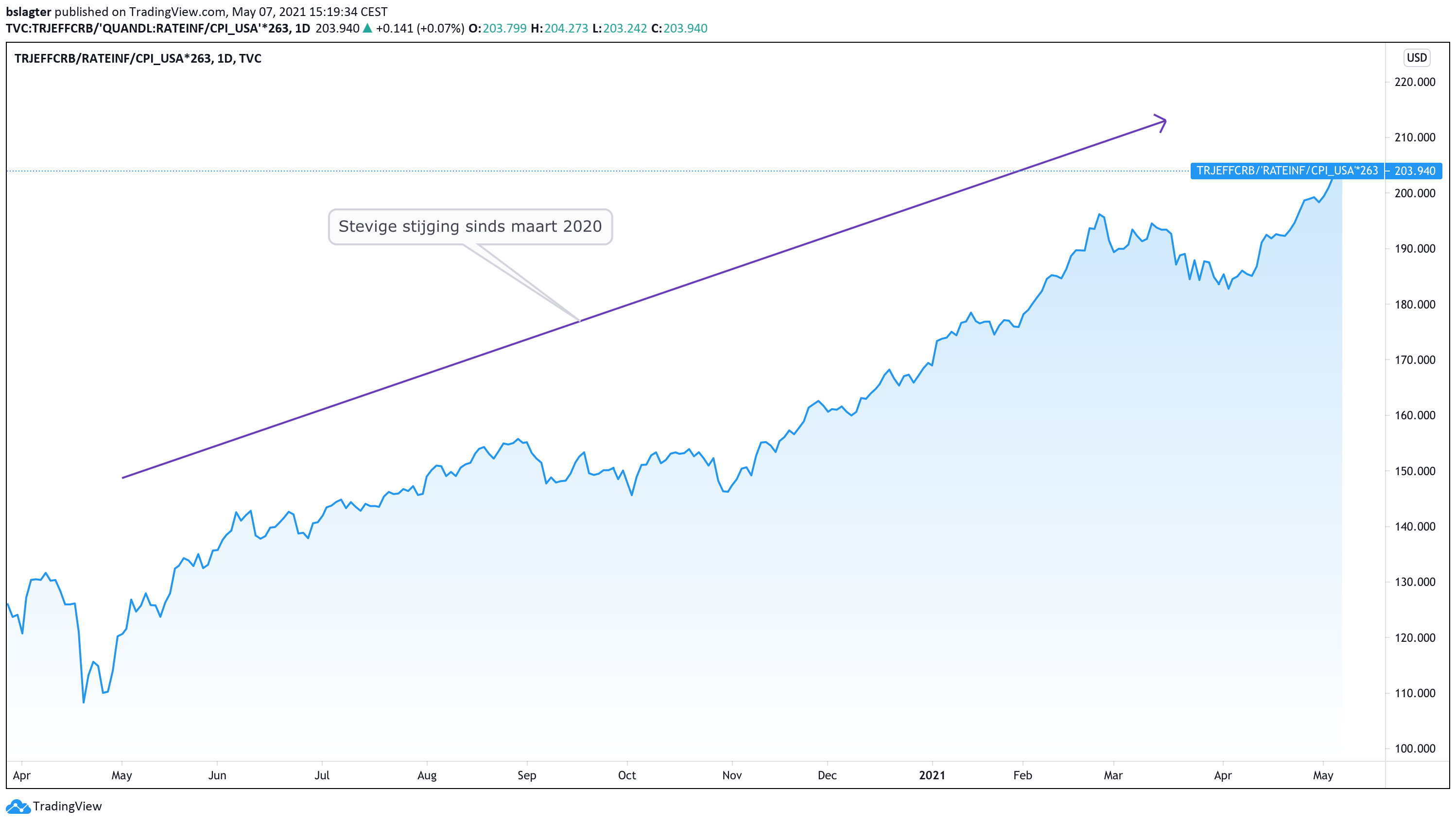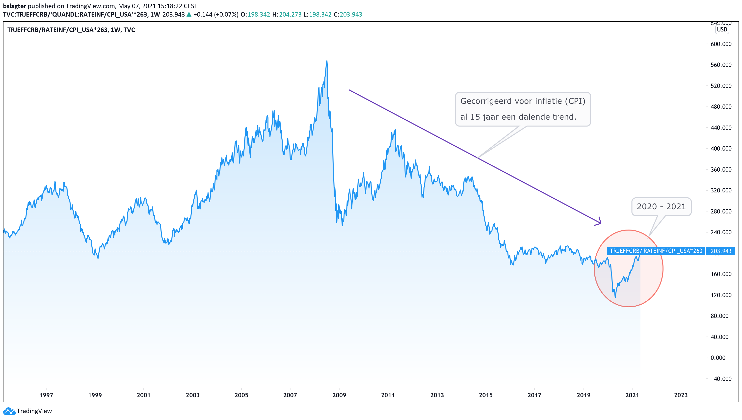 Net als bij de bitcoinkoers moet je bij inflatie goed kijken naar de tijdsperiode op de kaart: ‘when in doubt, zoom out’. Zo zien we dat de grondstoffenindex CRB flink gestegen is de afgelopen maanden...
