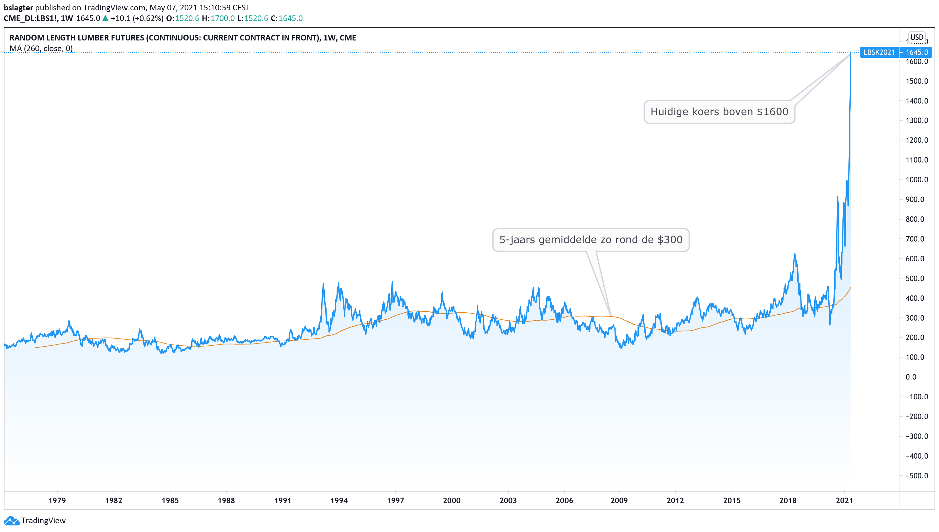 Bij timmerhout is dit vrijwel zeker ook het geval. De productie ervan kan snel worden opgeschaald als dat nodig is. De koers van grof hout (timber) is nauwelijks gestegen, wat suggereert dat er aan hout als grondstof geen gebrek is. Vermoedelijk zijn onvoldoende productiecapaciteit en verstoring van logistiek verantwoordelijk voor het tekort en de oplopende prijzen.