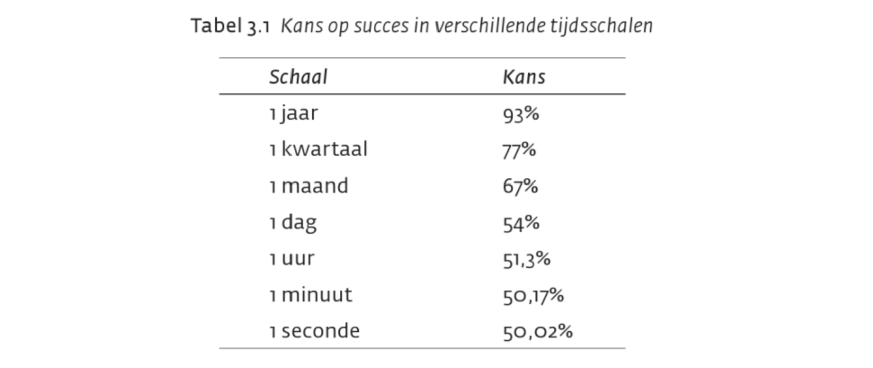 Met een verwacht rendement van 15 procent is de kans dat hij in een jaar een positief resultaat behaalt 93 procent. Maar op kleinere tijdsschaal ziet het er heel anders uit. De kans op succes in een dag is nog maar 54 procent en in een seconde slechts 50,02 procent.